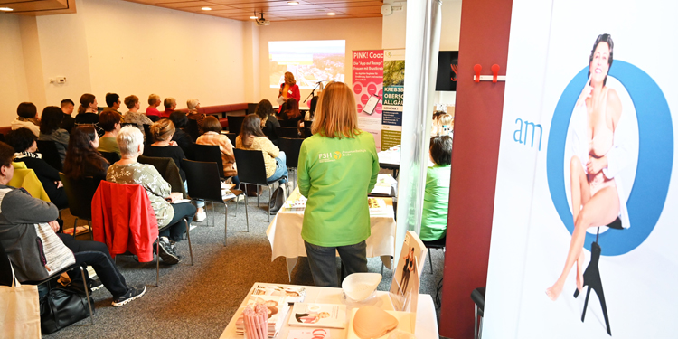 In der komplementären Pflege, die fortan im Fokus stand, geht es dagegen darum, die Patientin mit all ihren Fragen, Zweifeln, Ängsten und Nöten abseits der Medizin zu versorgen – beratend, helfend, kümmernd, im körperlichen und mentalen Bereich. Die Wangener Expertin Renate Traut präsentierte zunächst einen Überblick über seriöse Informationsquellen – etwa die von den Krankenkassen zugelassene Pink-App, die über viele Fragen aufklärt, oder die Krebsberatungsstelle Ravensburg-Wangen, die neben Informationen über Hilfe in der Region und an der OSK Kurse und Workshops anbietet – auch präventiv. „Ich kann nur jeder Frau empfehlen, unsere kostenlosen Brustselbstabtastungskurse zu belegen“, sagte Traut.
