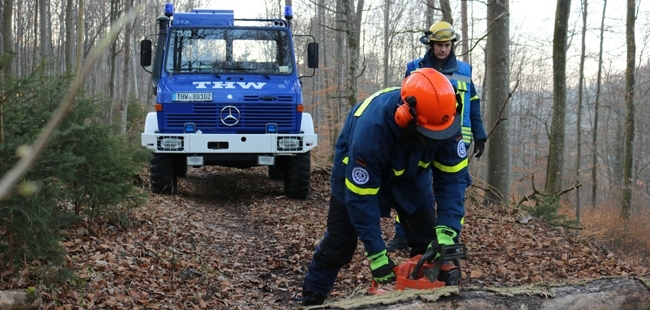Am Samstag gegen 05:30 Uhr wurde das THW Weingarten zur Wiederaufnahme einer Personensuche im Bereich Durlesbach, Bad Waldsee im Wald Richtung Greut alarmiert. Hier haben sich gestern während des schweren Unwetters ein Vater mit seinem Sohn im Wald aufgehalten, seither sind sie nicht wieder zurückgekehrt. Es wurde bereits am Vortag nach den beiden gesucht, jedoch musste die Suche am Vortag auf Grund der eintretenden Dunkelheit abgebrochen werden. Wegen des Sturms waren die Zufahrtsstrecken zum Wald mit umgestürzten Bäumen blockiert, welche erst von den Motorsägenführern frei gemacht werden mussten. Die Mannschaft des THWs konnte Vater und Sohn nach kurzer Zeit auffinden und mit dem Unimog im unwegsamen Gelände die Verletzten retten da eine Befahrung der Strecke mit dem Rettungswagen nicht möglich war.