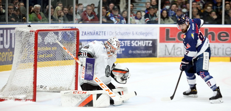 Damit war Hochspannung für den Schlussabschnitt garantiert. Beide Teams wussten, dass der nächste Fehler die Entscheidung bedeuten könnte. Dass die jeweils gegnerischen Angriffe schon in der neutralen Zone unterbunden wurden, überraschte da freilich nicht, hochkarätige Chancen gab es auf beiden Seiten nur ganz wenige. Doch dann kam es fünfeinhalb Minuten vor Ende der regulären Spielzeit zur alles entscheidenden Szene. Die Löwen Frankfurt nutzten mit zwei schnellen Pässen den Raum im Ravensburger Drittel, der Puck kam zu Reid McNeill und dessen knallharter Schlagschuss schlug platziert rechts oben zum 1:2 ein.