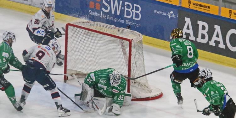 Dass die Bietigheim Steelers im zweiten Abschnitt stärker auftreten würden, war keine Überraschung. Die Gastgeber kamen nun zu deutlich mehr Chancen, die Towerstars hingegen nicht mehr so effektiv durch die neutrale Zone. Eine Phase mit Schlüsselcharakter durchlebten die Towerstars zwischen der 26. und 28. Spielminute. Mit Odeen Tufto und Jan Vieszinsky mussten zwei Ravensburger Spieler zeitgleich auf die Strafbank – den Towerstars drohte in doppelter Unterzahl eine Wende im Spiel. Doch die Oberschwaben machten die Passwege der Steelers erfolgreich dicht und was dennoch auf das Ravensburger Tor kam, war Beute des starken Ilya Sharipov. Der sicherte letztlich auch die Drei-Tore-Führung bis zur zweiten Pause. Wobei sogar das 0:4 mehr als nur in der Luft lag. Nach einem Break in der 34. Minute brachte Mark Rassel den Puck im gegnerischen Netz unter. Der Treffer wurde zunächst auch gegeben, hielt der Überprüfung der Videosichtung allerdings nicht stand. Nicolas Schindler hatte im Torraum den gegnerischen Torhüter gestreift.