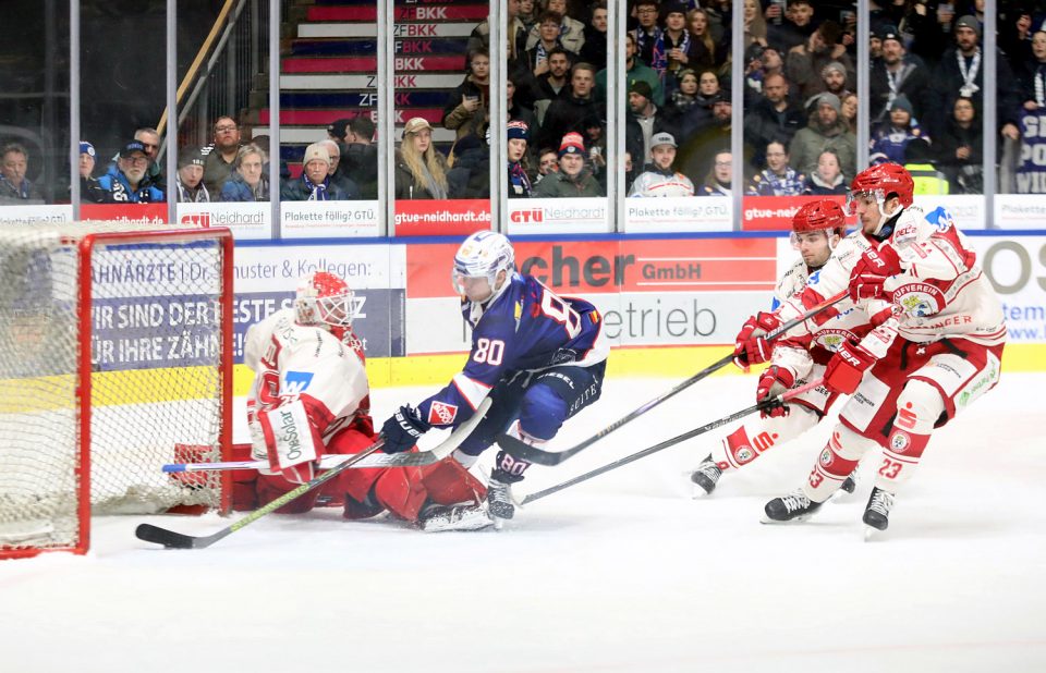 Kurze Zeit später, konkret in der 33. Minute, wurde das Spiel jedoch jäh unterbrochen. Hinter dem Tor von Ilya Sharipov klaffte am Bandenumlauf ein großes Loch. Nach ersten Reparaturversuchen entschieden die Hauptschiedsrichter nach Absprache mit den Teams, die Drittelpause vorzuziehen. Nach knapp 35 Minuten konnte das Spiel dann fortgesetzt werden. In der noch ausstehenden Zeit des zweiten Spieldrittels ging es hin und her, man merkte den Spielern beider Teams jedoch an, dass der Rhythmus erst wieder gefunden werden musste. Weitere Treffer blieben somit aus, dafür gab es schon nach 28 Sekunden im nun offiziell laufenden Schlussdrittel erneut Grund zum Jubel. Einen Distanzschuss von Denis Pfaffengut lenkte EVL-Keeper Philipp Dietl mit der Stockhand im hohen Bogen ab, und den wieder herunterfallenden Puck bugsierte Alexander Dersch mit dem Schienbein ins eigene Tor.