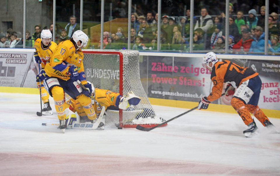 Apropos Strafzeiten: Nachdem die 18 Strafminuten bereits im zweiten Abschnitt immer wieder den Spielfluss unterbrochen hatten, zeigte sich im dritten Drittel mit weiteren handfesten Nicklichkeiten und 16 Strafminuten ein noch zerfahreneres Bild. Auf den Spielstand hatte das jedoch keine Auswirkungen mehr, denn die Towerstars kontrollierten die Partie weitgehend souverän und ließen nichts mehr anbrennen. So durfte dann auch Nico Pertuch seinen ersten Shutout der Saison bejubeln und sich von den Fans feiern lassen.