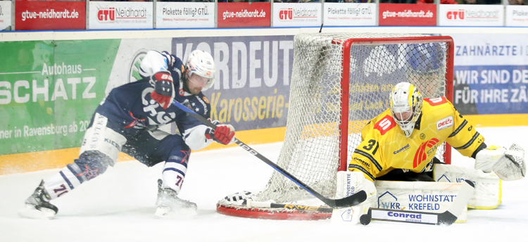 Die Ravensburg Towerstars sind am Sonntagnachmittag beim Heimspiel gegen die Krefeld Pinguine leer ausgegangen. In einem hart umkämpften Spiel konnten die Oberschwaben den aus der 37. Minute resultierenden Rückstand am Ende nicht mehr wettmachen und unterlagen mit 2:3. Der Vorsprung auf Platz 4 schmolz damit auf zwei Punkte.