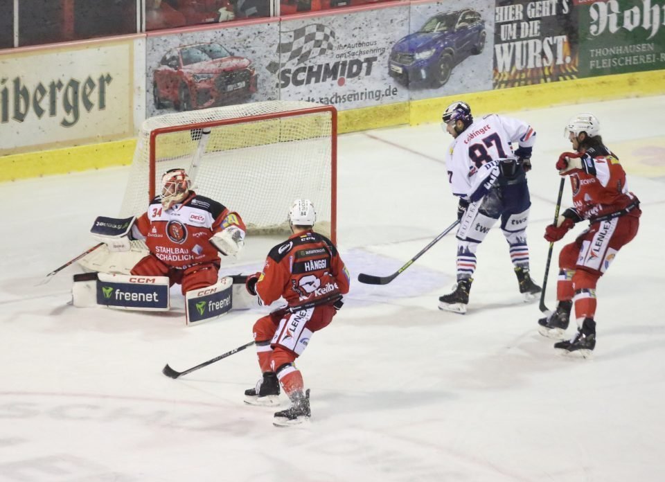 Die Westsachsen hielten sich jedoch im Spiel. Ein der linken Bande entlang gespielter Pass entwickelte sich aufgrund eines Ausrutschers von Daniel Schweiger im Zweikampf plötzlich zur 2 gegen 1 Situation, die Filip Reisnecker letztendlich zum 2:3 Anschlusstreffer veredelte. Das Spiel war wieder völlig offen und die Towerstars mussten jetzt auch gegen die Stimmung der Ränge ankämpfen. Gleich mehrfach hatte Towerstars Keeper Jonas Langmann in höchster Not zu retten. Aber auch die Oberschwaben hatten durchaus gute Möglichkeiten auf den nächsten Treffer, Robbie Czarnik und auch Max Hadraschek scheiterten aus vielversprechenden Positionen.