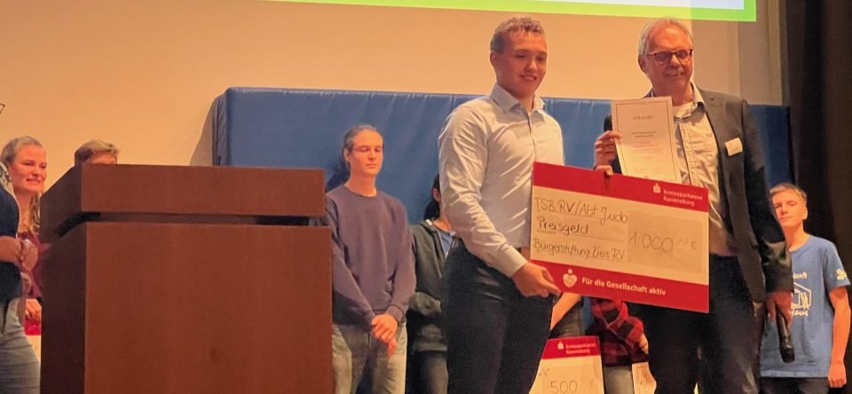 „Preisgekrönt 2022“ wurde hier am vergangenen Donnerstag in der Mensa der Gymnasien Ravensburg auch das Angebot der TSB-Judoka, die mit ihrem Projekt „Judo, der sanfte Weg für ALLE MENSCHEN“ mit 20 Mitbewerbern in die Auswahl genommen wurden. Am Ende wurden die TSB-Judoka mit dem dritten Platz und einem Preisgeld von 1.000 Euro belohnt.
