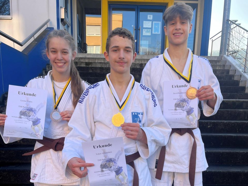 Großer Erfolg für den TSB Ravensburg: Judoka Yehor Afonichkin hat sich bei den Württembergischen Einzelmeisterschaften der U18 souverän den Titel gesichert. Mit sechs Siegen in Folge dominierte er seine Gewichtsklasse bis 66 Kilogramm eindrucksvoll. Ebenfalls Grund zur Freude hatten David Rambosek und Leonie Vieira, die jeweils die Bronzemedaille erkämpften.