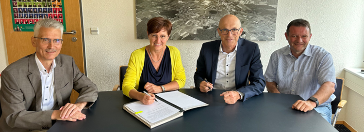 Bildunterschrift (v. l.): Unterzeichneten den neuen Gaskonzessionsvertrag zwischen der Gemeinde Wilhelmsdorf und der TWS Netz GmbH: Michael Scheible, TWS-Bereichsleiter Technik, Sandra Flucht, Bürgermeisterin von Wilhelmsdorf, Helmut Hertle, Geschäftsführer der TWS Netz und Stephan Gerster, Leiter Rechnungsamt.