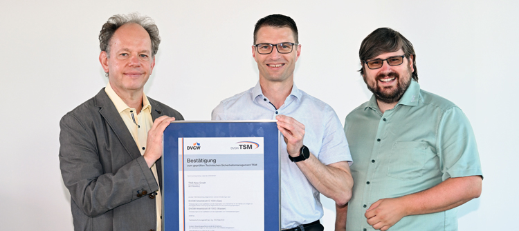Prüfung bestanden: Das hat die TWS Netz GmbH seit Montag (8. Juli) schriftlich. Eine Urkunde bescheinigt dem Unternehmen, dass sein Technisches Sicherheitsmanagement (TSM) höchste Standards erfüllt. „Die TWS ist in allen Sparten – Strom, Erdgas und Trinkwasser – sehr sicher aufgestellt, das hat die Zertifizierung auch diesmal ergeben“, sagt Thomas Anders, Geschäftsführer der DVGW-Landesgruppe Baden-Württemberg, bei der Übergabe des Nachweises. Er vertritt den Fachverband Deutscher Verein des Gas- und Wasserfaches e. V. (DVGW), der gemeinsam mit dem Forum für Netztechnik und Netzbetrieb die Prüfung vorgenommen hat.