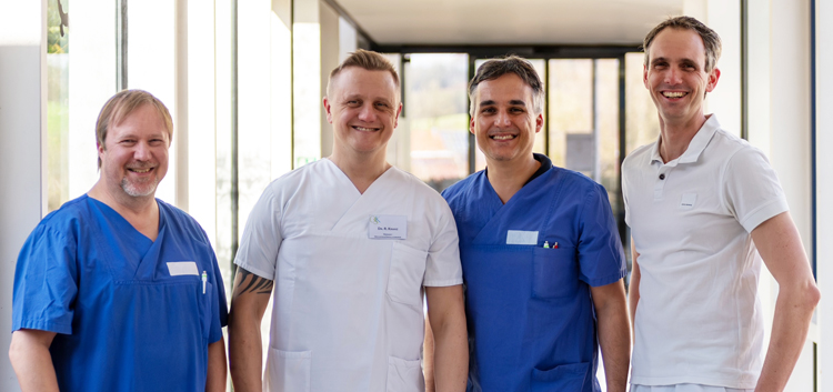 WANGEN – Gleich vier Oberärzte am Westallgäu-Klinikum Wangen haben erfolgreich die Prüfung zur Zusatzbezeichnung „Klinische Akut- und Notfallmedizin“ abgelegt. Damit ist die Notaufnahme unter Leitung von Dr. Timo Gentner, der selbst zu den Absolventen gehörte, künftig 24 Stunden rund um die Uhr immer mit mindestens einem ausgewiesenen Spezialisten besetzt. Gentner und Dr. Michael Reitmayer vertreten dabei als Fachärzte die Innere Medizin, Gentners Stellvertreter Dr. Daniel Hennecke und Dr. Raphael Kranz die Unfallchirurgie und Orthopädie.