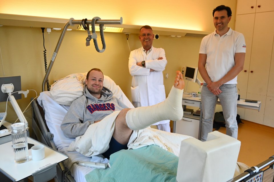 Der Stürmer, seit fünf Jahren Spielführer, wird während seiner Reha-Zeit zunächst in Ravensburg bleiben, seine Freundin stammt von hier, und von Dr. Fabian ambulant weiterversorgt werden. Bereits heute darf Vincenz Mayer das Krankenhaus an Krücken und in einem orthopädischen Spezialstiefel verlassen. „Ich habe mich in der Klinik hier in Wangen sehr wohl und gut aufgehoben gefühlt, das Pflegeteam und die Leute hier sind sehr freundlich, es hat mir an nichts gefehlt“, sagte Mayer, der in einem Sweatshirt seines NHL-Lieblingsclubs New York Rangers, Ex-Club von Mark Messier und Jaromir Jagr, im Krankenbett lag.