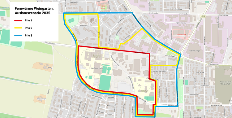 Die Expertinnen und Experten haben bei der kommunalen Wärmeplanung in Weingarten insgesamt fünf Gebiete festgelegt, in denen die Versorgung zukünftig durch ein Wärmenetz sichergestellt werden soll. In der ersten Phase liegt der Fokus auf dem Schulzentrum, weitere Gebiete sind der Hochschulcampus, die Kernstadt, das Gebiet der Köpfingerstraße und die Untere Breite.