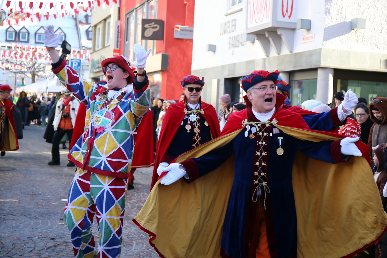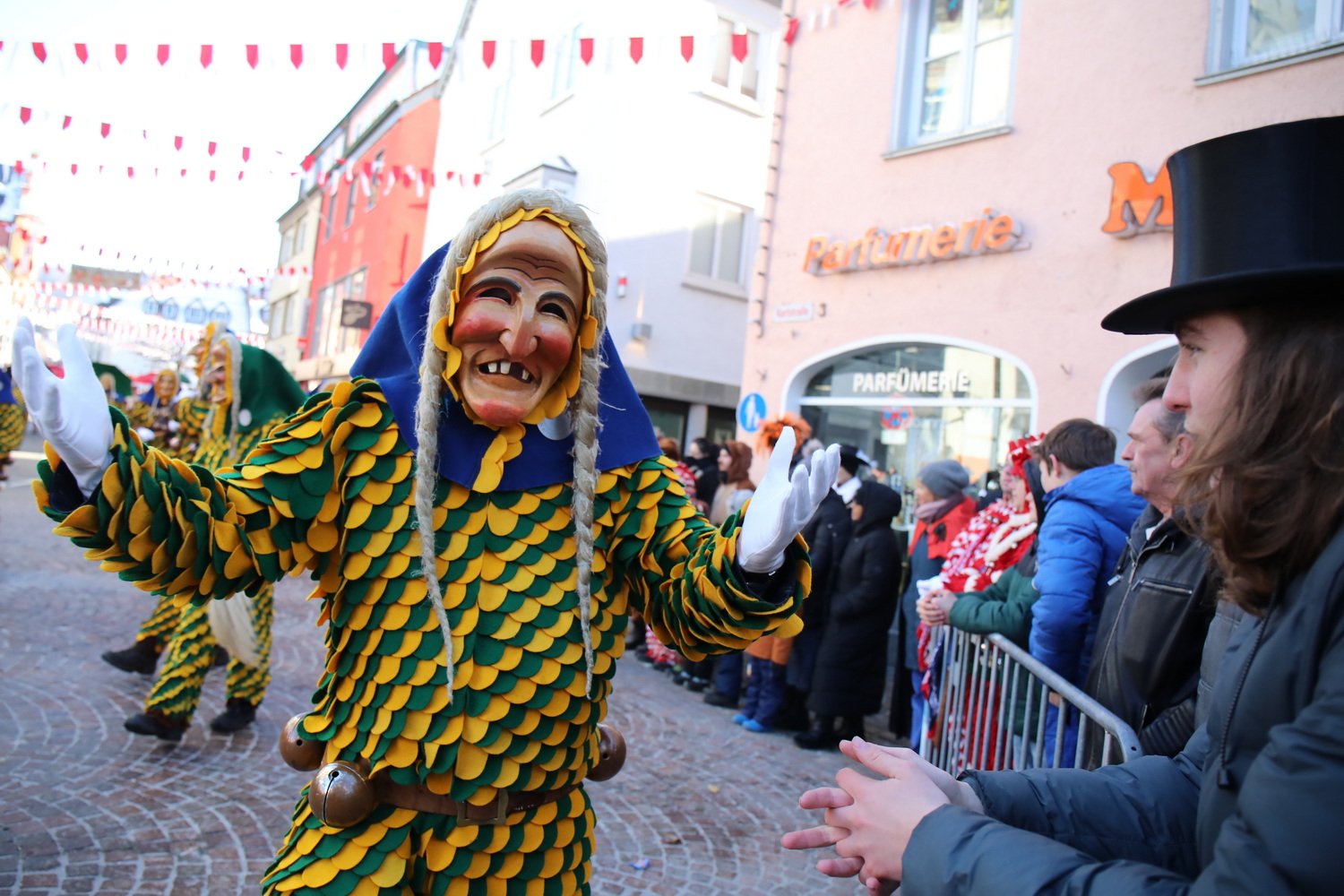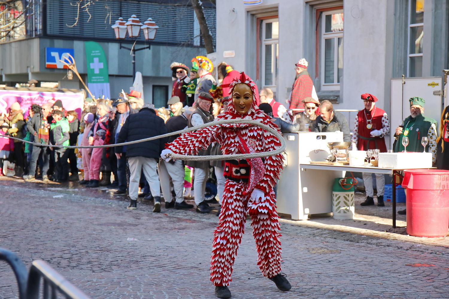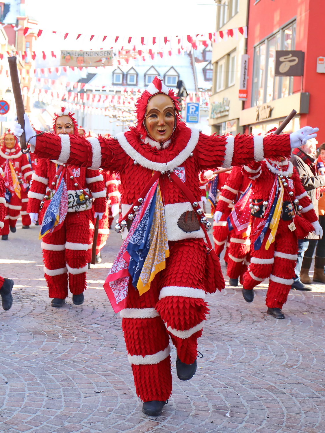 Am Samstag um 12 Uhr zog sich ein weiterer kleiner Narrensprung durch die Innenstadt. Hier waren die VSAN-Zünfte Oberschwaben-Allgäu, von Bad Waldsee bis Lindau, zu Gast. Zwar waren die Temperaturen frostig, doch der blaue Himmel und die Sonne ließen das schnell vergessen. Danach ging es zum närrischen Markt und den Aktionsbühnen mit einem umfangreichen Rahmenprogramm mit Tänzen und Bräuchen.