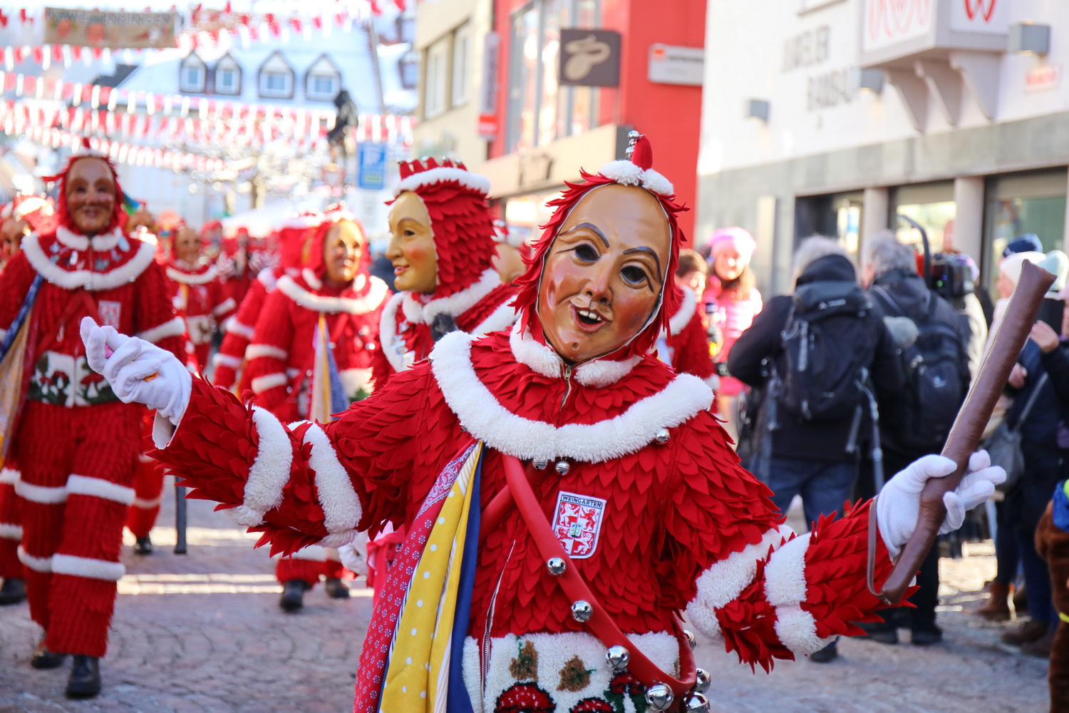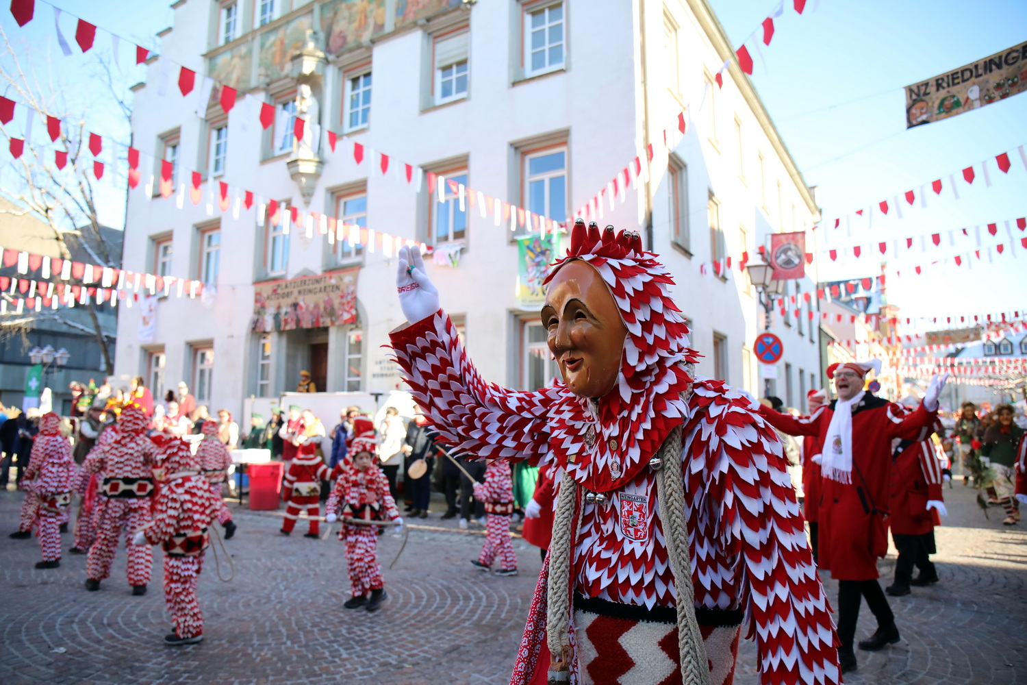 Seit Freitag und noch bis Sonntag wird in Weingarten ein besonderes Jubiläum gefeiert. Zum 100. Bestehen der Vereinigung Schwäbisch-Alemannischer Narrenzünfte sind beim Großen Narrentreffen bis zu 12.000 Narren der Mitglieds- und Partnerzünfte zu Gast. Zehntausende von Besuchern und Schaulustigen aus der gesamten Region feiern ausgelassen mit.
